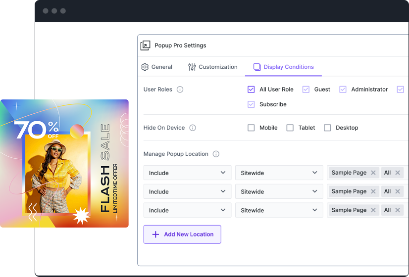 Here, you can configure Popup display settings. You can specify Popup visibility by user role. Define the display area, including/excluding specific pages, posts, projects, or Popups.