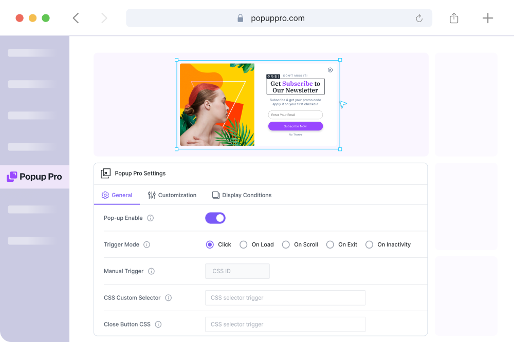 Custom CSS Selector: You can define custom CSS selectors to target specific elements for Popup activation. Specify CSS selectors (e.g., .popup-class, #pop-upid) to trigger popups.